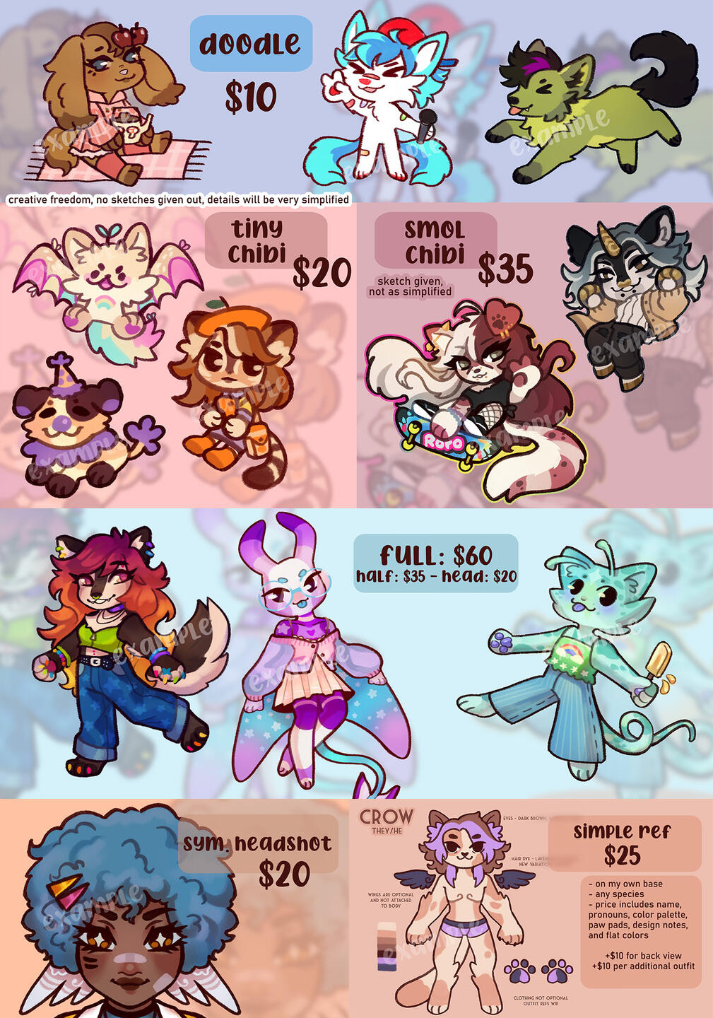 After artwork content is agreed on, payment is taken upfront before work on a commission is started. Certain exceptions can be negotiated for return commissioners.